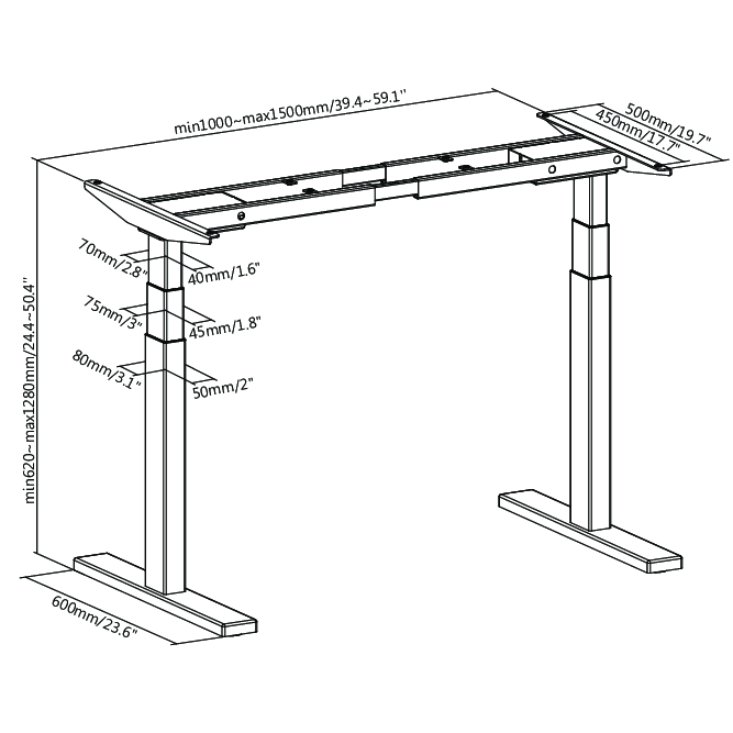 У данной модели 2 независимых мотора в каждой из опор. В базовой комплектации присутствует сенсорный пульт запоминания высоты на 2 положения. Каждая опора стола состоит из 3-ех сегментов. По высоте механизм стола регулируется от 62 до 128 см., и раздвигается по длине в диапазоне от 100см до 150 см. Рама стола выдерживает нагрузку до 125 кг. Модель включает в себя защитные режимы: система защиты от зажима при опускании и поднятии стола, защита от перегрузки.